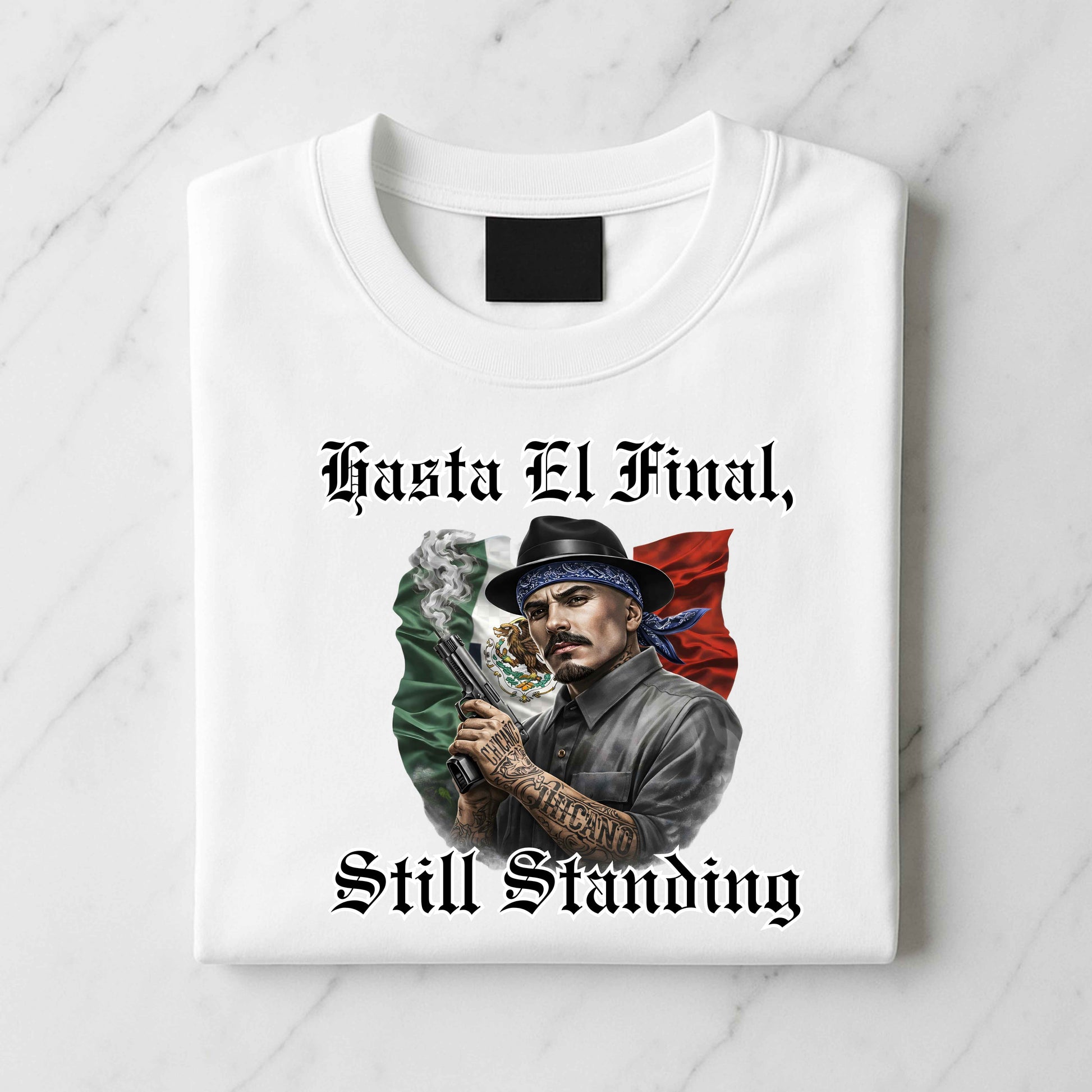 Astsa El Final Still Standing. T-Shirt Wear a statement of resilience with this premium graphic tee. Featuring bold, meaningful artwork that celebrates perseverance and strength, this shirt combines comfort with purpose. Crafted from quality fabric, it's designed to last through everyday wear while making an impact. Perfect for those who value authenticity and aren't afraid to stand firm in their convictions. A versatile piece that works as a standalone statement or layered with your favorite outerwear.