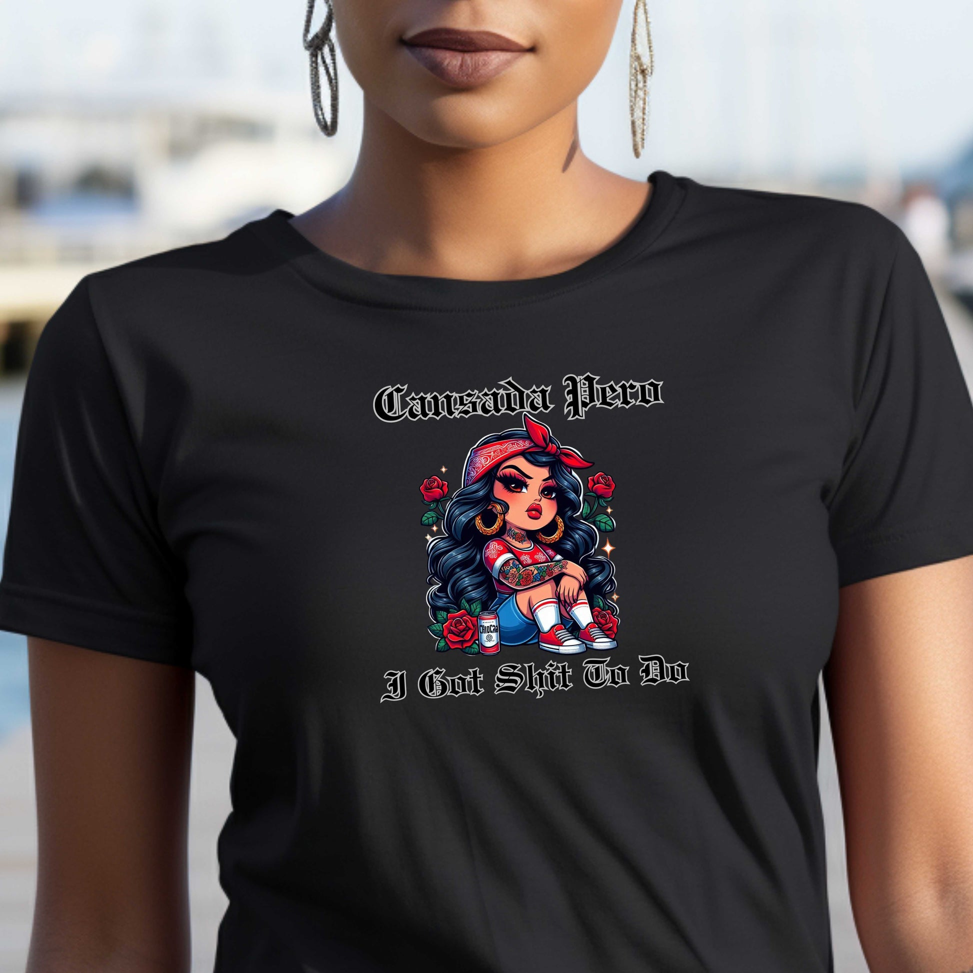 Embrace your hustle with the "Cansada pero I got shit to do." T-Shirt. Crafted for those who push through fatigue, this tee combines comfort and motivation, helping you stay focused and energized. Its bold statement makes it perfect for anyone balancing busy days with determination and style.