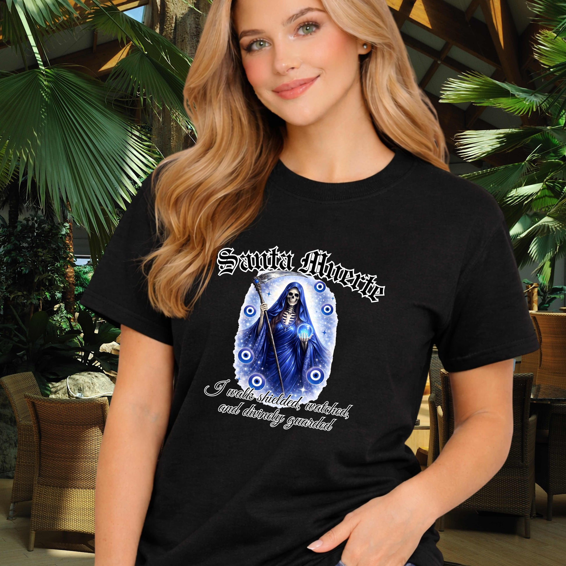 Santa Muerte, the folk saint venerated across Latin America and beyond, represents protection, justice, and spiritual strength. This tee features bold, contemporary artwork celebrating her iconic imagery and the devotion of her followers. Perfect for those who honor her legacy or appreciate striking graphic design, this premium print-on-demand tee combines comfort with cultural significance. Wear your faith and find strength in her protection.