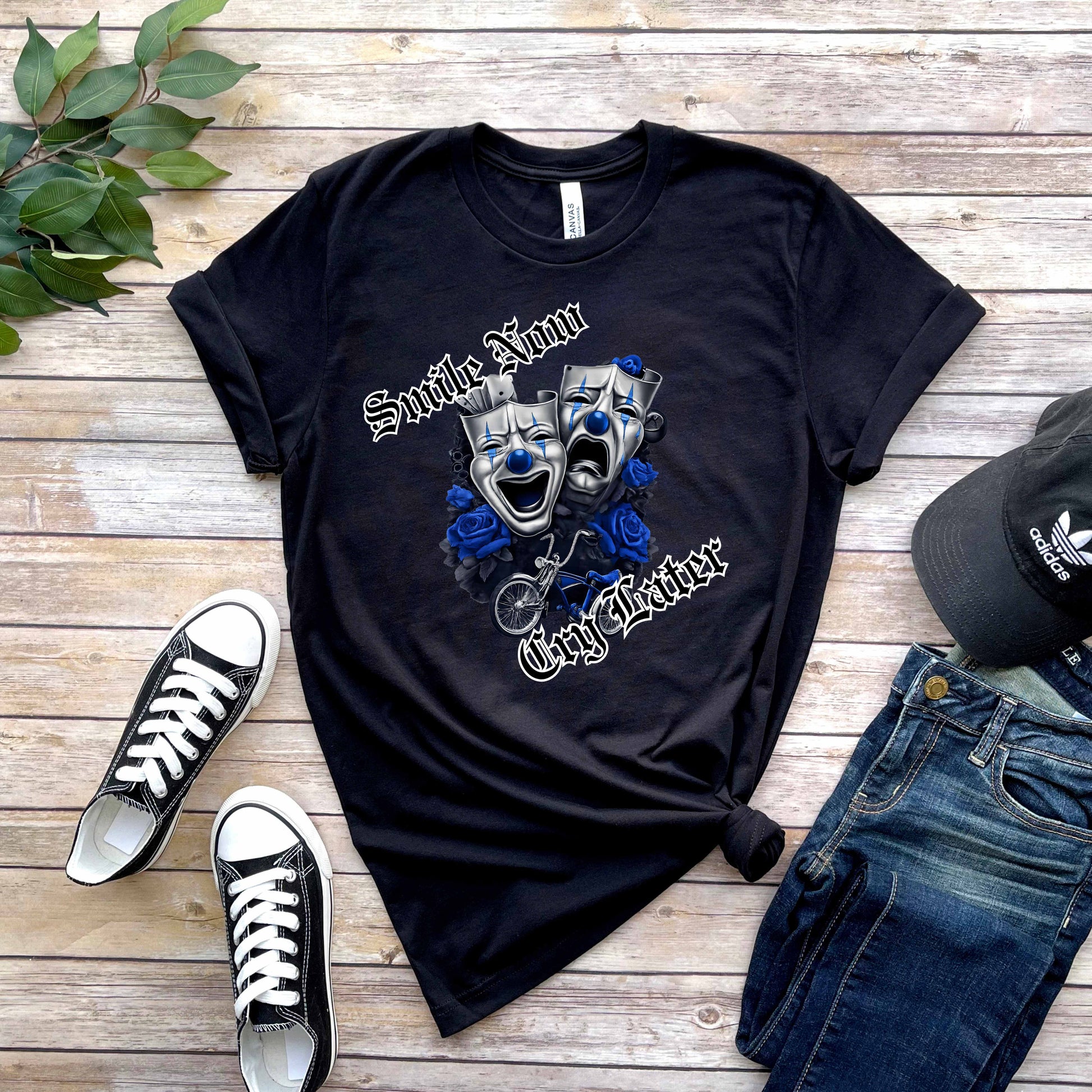 Embrace the duality of emotion with this striking graphic tee. The "Smile Now Cry Later" design captures a timeless philosophy—celebrating life's highs while acknowledging its depths. Crafted from premium cotton, this shirt delivers comfort that lasts through wear and wash. Perfect for those who appreciate bold, meaningful statements and aren't afraid to wear their complexity. A versatile piece that pairs effortlessly with jeans, shorts, or layering pieces for any season.